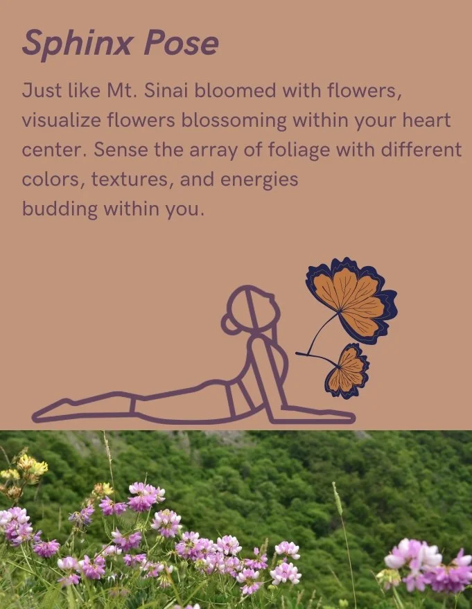 Just like Mt. Sinai bloomed with flowers, visualize flowers blossoming within your heart center. Sense the array of foliage with different colors, textures, and energies budding within you. Appreciate how just like G-d created so many unique types of flowers, the people of Israel are diverse and special in all their unique forms.